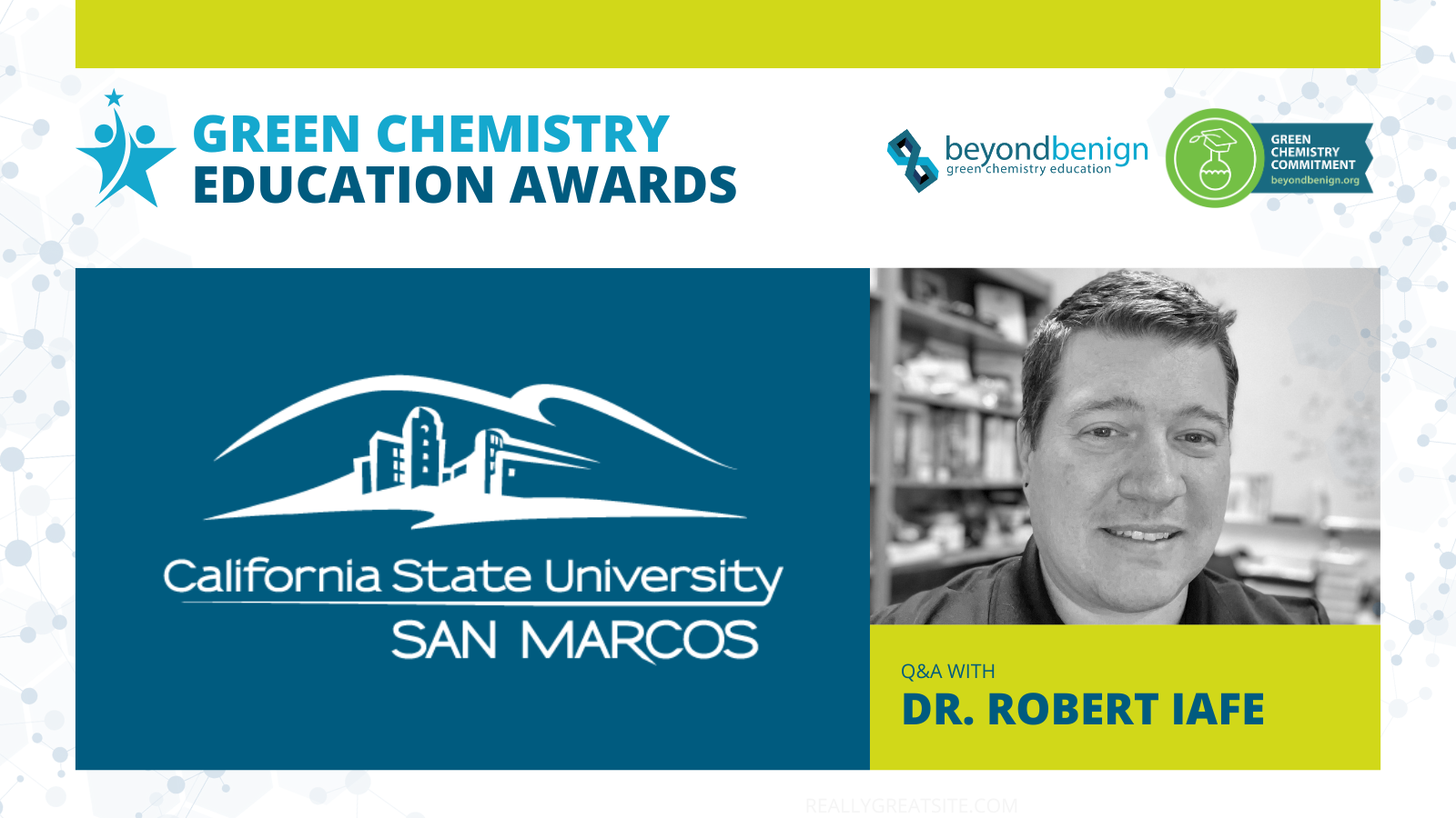 At California State University, San Marcos, Associate Professor Dr. Robert G. Iafe is coordinating the university’s efforts to develop a green chemistry minor by adding courses, assessment strategies, and public awareness seminars. He says the green chemistry initiative has helped students develop a new sense of purpose and enthusiasm. “Many of our students come from communities that are disproportionately impacted by environmental issues, so when they see chemistry as a means of creating safer materials, cleaner technologies, and more equitable systems, it becomes more than just a course—it becomes personally meaningful and empowering,” he says.