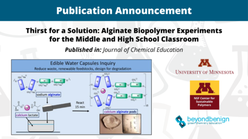 This new ACS Journal of Chemical Education article titled Thirst for a Solution: Alginate Biopolymer Experiments for the Middle and High School Classroom features the synthesis of biodegradable calcium alginate capsules prepared from food-safe chemicals. The capsules are considered as replacements for single use water bottles and students are challenged to design an inquiry experiment. This hands-on experiment was developed by Dr. Jane Wissinger (University of Minnesota) and her research students, in partnership with Beyond Benign teachers and staff.