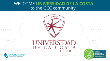 A warm welcome to our newest Green Chemistry Commitment (GCC) Signer, the Department of Natural and Exact Sciences at Universidad de la Costa. The department is deeply committed to forming professionals & citizens with a high sense of responsibility to a more sustainable world. The faculty currently incorporates green chemistry principles throughout an ecotoxicology course and into tutorial research programs in ecotoxicology and green chemistry. The institution is the second in Colombia to join the GCC program and offers an Environmental Engineering, Sustainable Development Master, and Doctoral Degree.