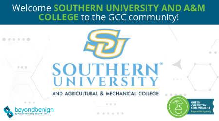 Through our partnership with Dow to support our 25×25 Initiative Beyond Benign is thrilled to welcome Southern University and A&M College to our Green Chemistry Commitment (GCC) community! The Chemistry Department at Southern University will start Green Chemistry education by implementing Green Chemistry Principles in undergraduate chemistry courses and laboratories, General Chemistry, Organic Chemistry, Analytical Chemistry, Physical Chemistry, Inorganic Chemistry, and Biochemistry. The institution is the third HBCU (Historically black colleges and universities) to join the GCC program.