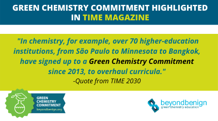 The Executive Director & Co-Founder of Beyond Benign, Amy Cannon, is thrilled to see the Green Chemistry Commitment highlighted in connection with the climate crisis and how higher education institutions are adopting it in their curricula. Teaching future chemists how to design products and processes that are healthier and safer for humans and the environment is an upstream, preventive, solutions-oriented approach to address local and global sustainability challenges. Read in TIME Magazine how higher education curricula across many disciplines are changing.