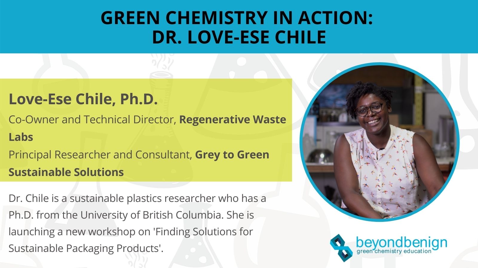 Beyond Benign was introduced to the amazing Dr. Love-Ese Chile, who runs two businesses – Grey to Green Sustainable Solutions and Regenerative Waste Labs. We took the opportunity to interview Dr. Chile on her experience in green chemistry and invention. She shared with us her upcoming workshops, her inspiration and how she loves to spark the imagination of the future that can be possible through chemistry.