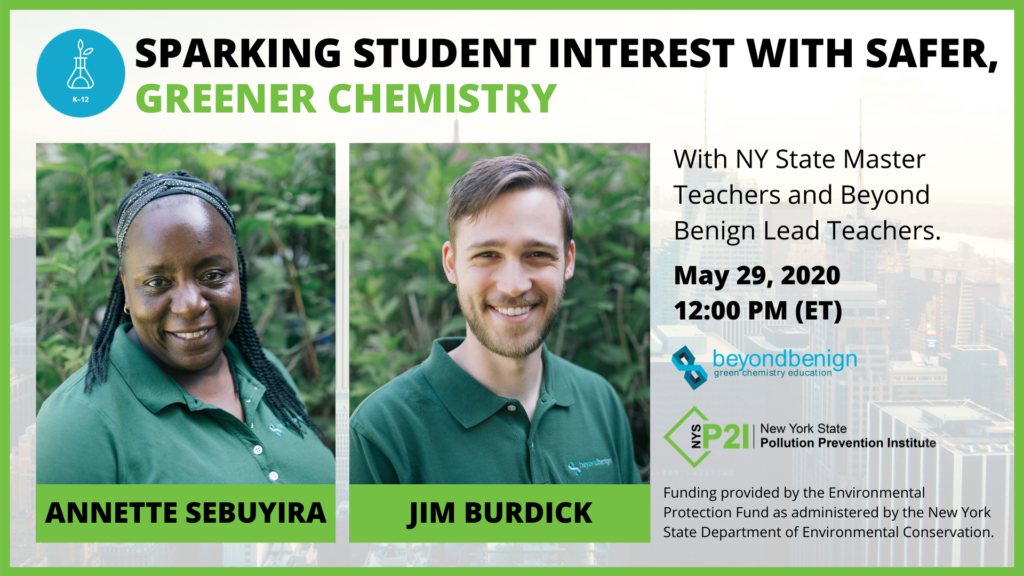 In partnership with NYSP2I, Beyond Benign is excited to offer New York State teachers free opportunities to learn more about green chemistry education, access to open-source green chemistry curriculum, and information on NYSP2I’s chemical clean out programs. The New York programming leads off with a webinar on May 29, 2020 at 12:00PM EST titled “Webinar: “Sparking Student Interest with Safer, Greener Chemistry”. This webinar will highlight Annette Sebuyira and Jim Burdick, two active New York State Master Teachers and Beyond Benign Lead Teachers, and how they combine the inquiry process and green chemistry in their classroom to keep students engaged and curious. They will share how to explore phenomena and fill your students with wonder while cultivating a safe and sustainable culture in your lab by examining chemical or physical changes and endothermic or exothermic reactions. This free event is co-organized by Beyond Benign and New York State Pollution Prevention Institute.