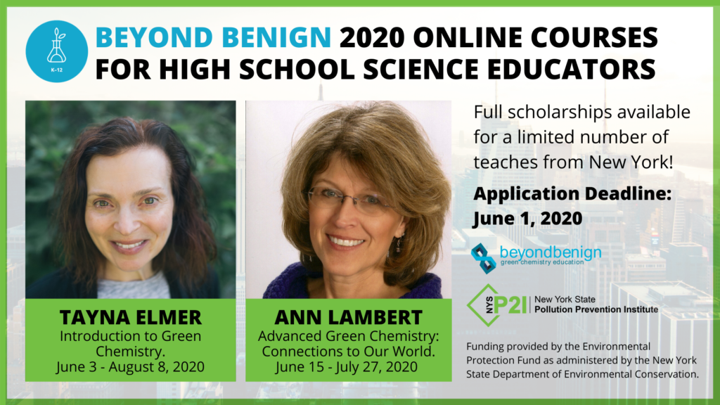 Following the webinar, Beyond Benign in partnership with New York State Pollution Prevention Institute will offer full scholarships to Beyond Benign’s asynchronous green chemistry online courses. These two courses are in a 6-8 week an asynchronous format and equivalent of 48 credit-hours with optional 3 graduate education credits available.* These courses are taught by Beyond Benign Lead Teachers, Tayna Elmer, and Ann Lambert, who have extensive experience teaching green chemistry in their classroom and developing green chemistry curriculum.
