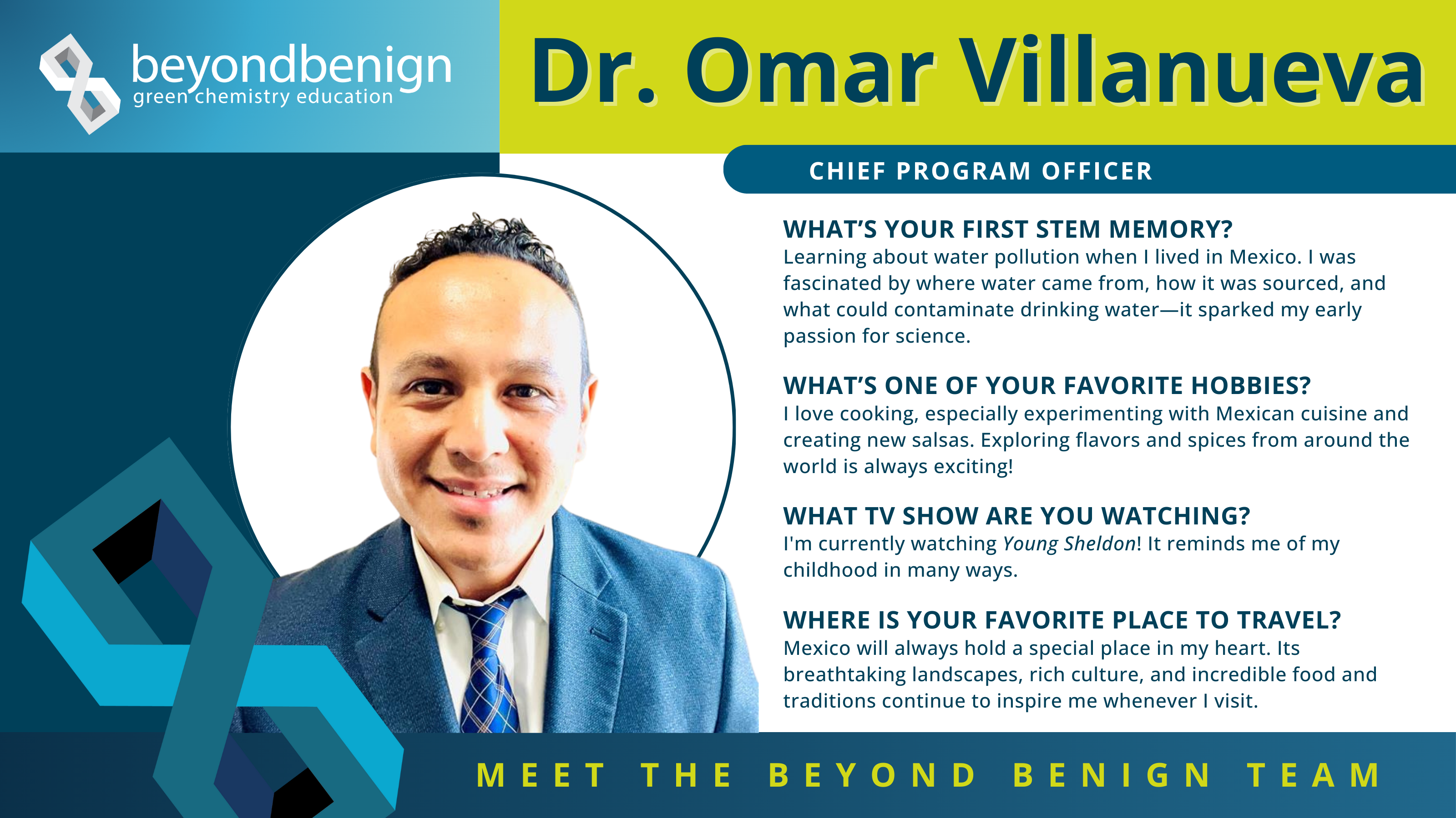In this Q&A, Omar shares more about the educational and professional journey that led him to his new role at Beyond Benign and his vision for the role that green chemistry can play for future learners and organizations.
