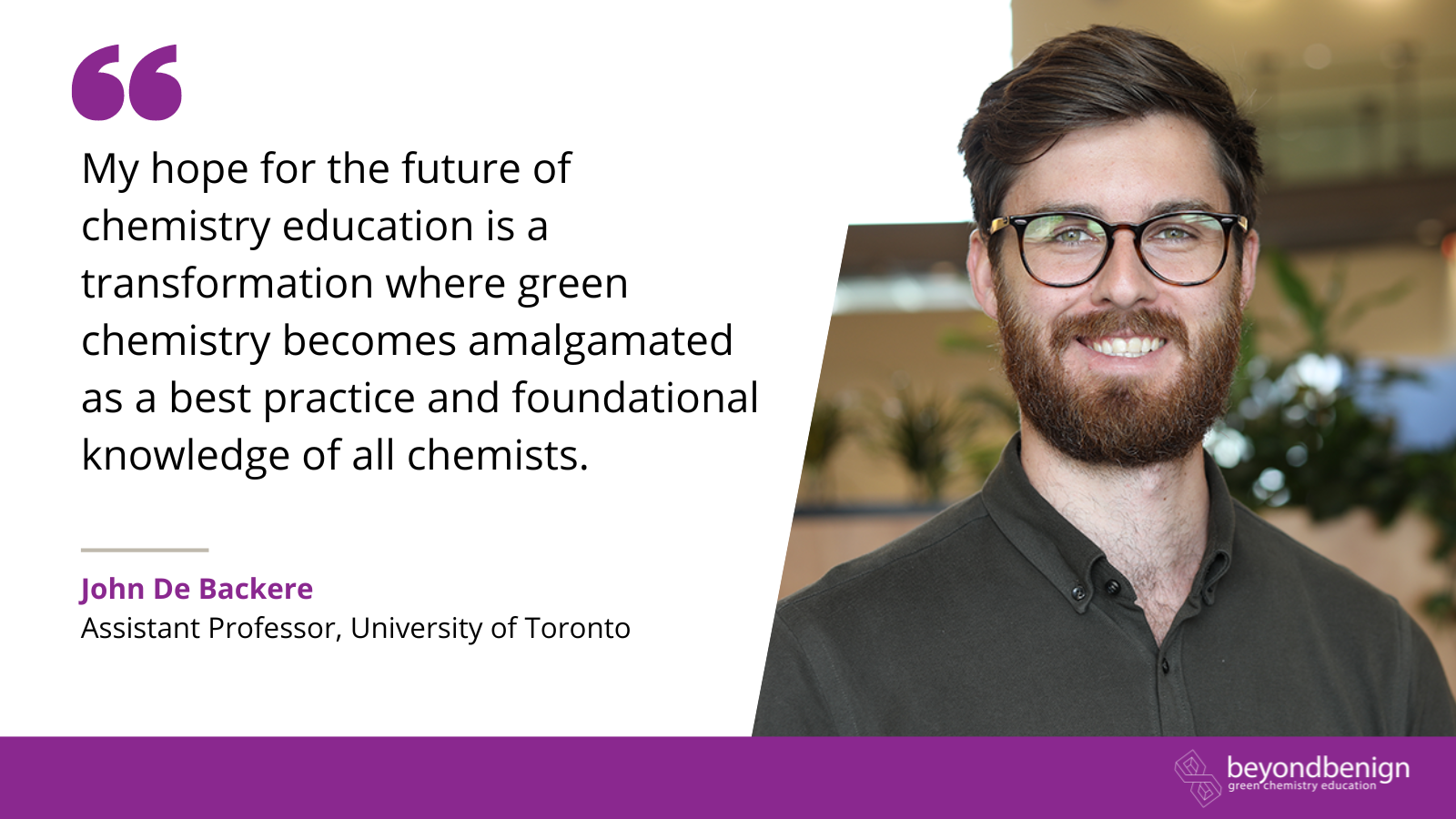 My hope for the future of chemistry education is a transformation where green chemistry becomes amalgamated as a best practice and foundational knowledge of all chemists. I think the future is quickly approaching thanks to efforts from organizations like Beyond Benign, with recent milestones like ACS-approved Bachelor’s degree programs requiring curriculum that provides students with a working knowledge of the 12 Principles of Green Chemistry.