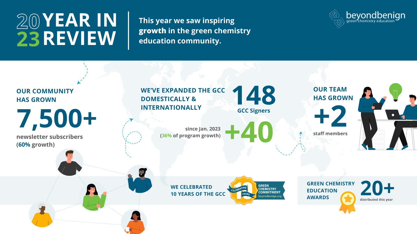 As our global green chemistry community continues to grow, we at Beyond Benign find ourselves asking these two critical questions time and time again. This is why you may have seen us– virtually or in person– at any one of the many green chemistry conferences, webinars, seminars, or ceremonies 2023 had to offer.