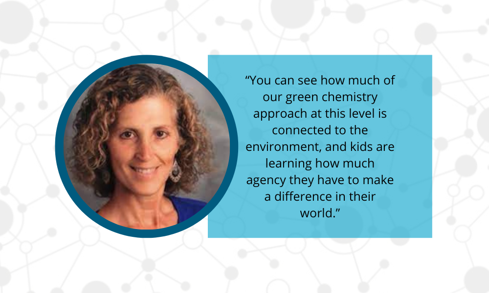 Having hands-on experience with changing the world around them through chemistry has been impactful for her students. “You can see how much of our green chemistry approach at this level is connected to the environment, and kids are learning how much agency they have to make a difference in their world,” Veronica says. “They learn it is very possible to influence their surroundings through their understanding of science. We don’t have labs where we are using a lot of intense chemicals, so we had to find a way for kids to connect.”