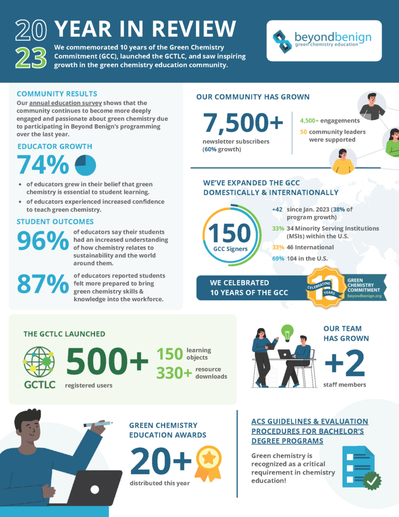 To further support this community, in 2023, Beyond Benign launched the Green Chemistry Teaching and Learning Community (GCTLC), an online platform for the community and by the community to provide a space for learning, connecting, and sharing within the green chemistry community. This platform is critical to advancing the rapidly growing green chemistry teaching and learning community as more institutions start incorporating green chemistry into their curriculum.
