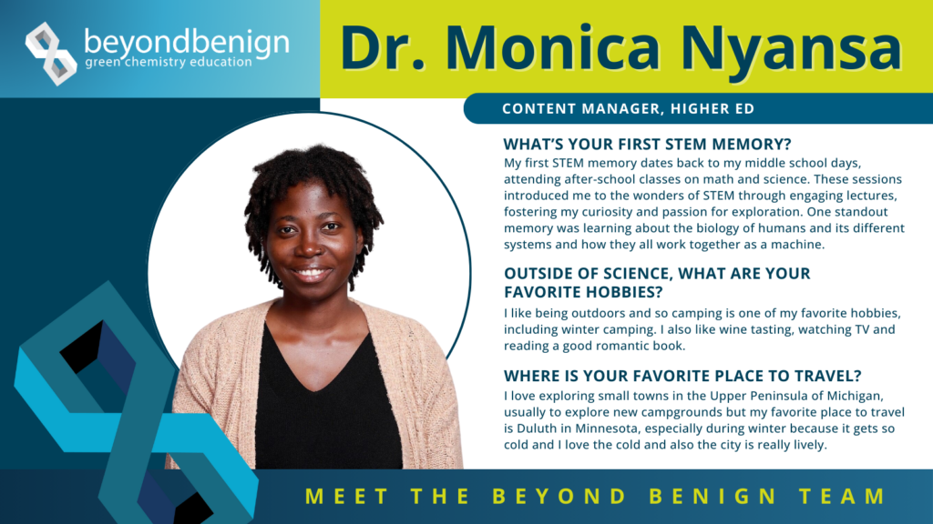 Meet Beyond Benign’s newest team member, Dr. Monica Nyansa! We are proud to welcome Monica to our team as the Content Manager of Beyond Benign’s Higher Education programming.