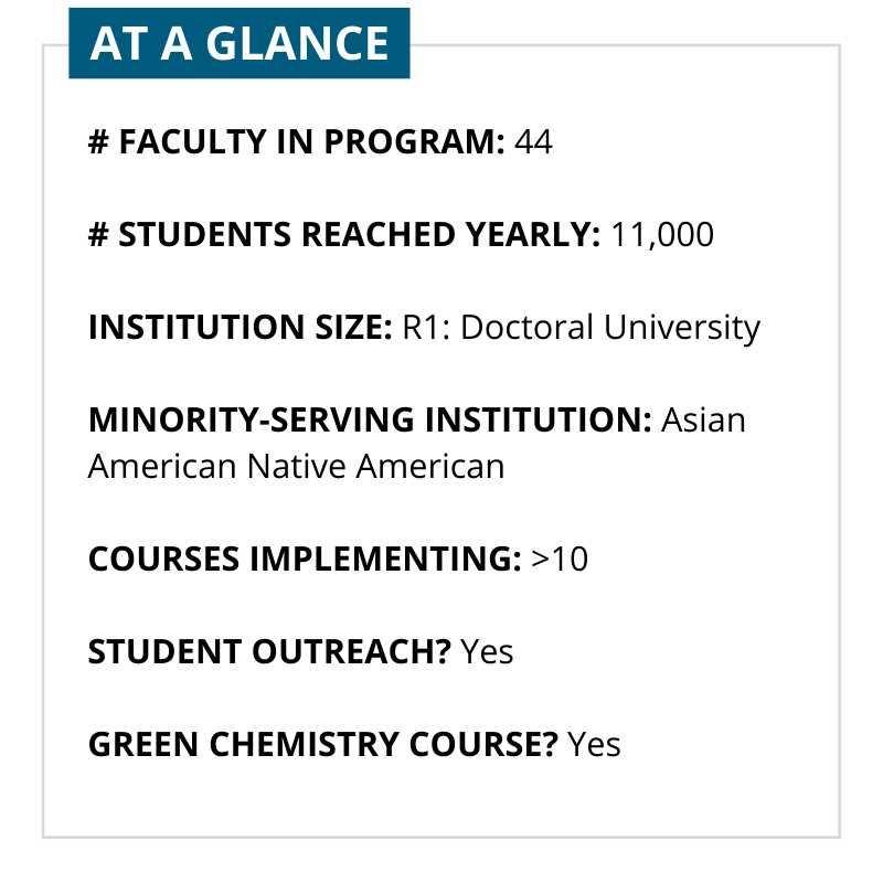 Since signing the GCC in 2013, many new and diverse initiatives evolved through the support and resources provided through this program. Green chemistry was already incorporated in the organic laboratory course, but the GCC sparked interest in developing a dedicated green chemistry upper-division lecture course. This course has been taught by five different faculty instructors, each with their own influences and research connections, expanding the breadth and diversity in green chemistry and engineering concepts for our students.