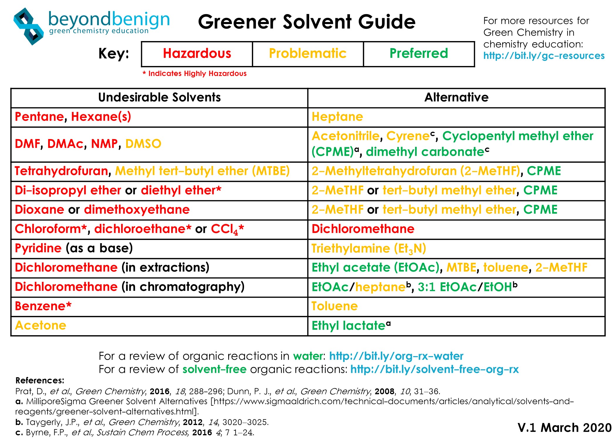 The Beyond Benign Greener Solvent Guide of classically used solvents for teaching laboratories is based on select solvent selection guides and greener solvent alternatives available from MilliporeSigma.