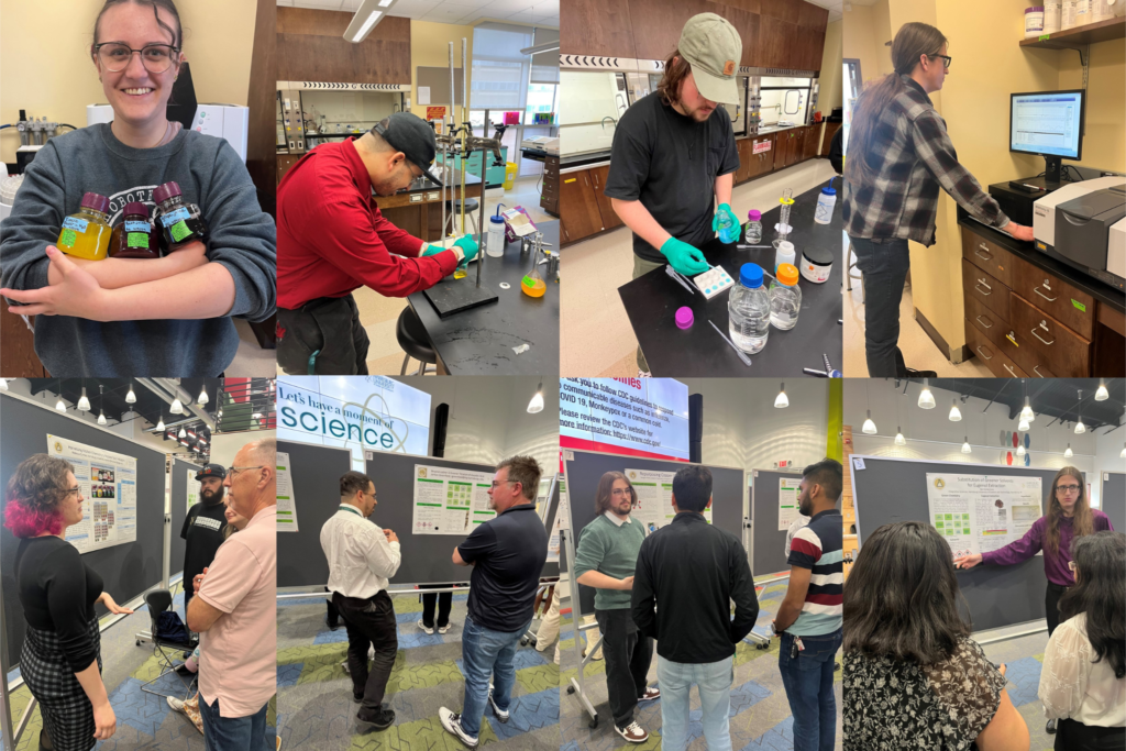 The bottom row of the collage are photos of the students presenting their redesigned labs at the annual HU Symposium. Their poster presentations were very well-received by other students, faculty, staff, and administrators and raised green chemistry awareness in the broader HU community. In fact, two of the students tied for 1st place in the poster category!