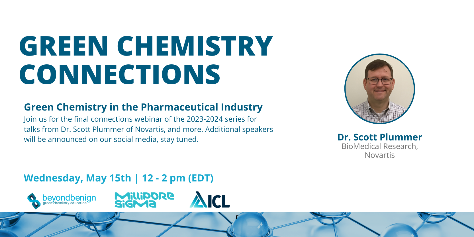 Beyond Benign will host virtual and monthly Green Chemistry Connections around Green Chemistry education using the Green Chemistry Students Learning Objectives from the Green Chemistry Commitment program as a loose framework. Register to stay in the loop about upcoming speakers.