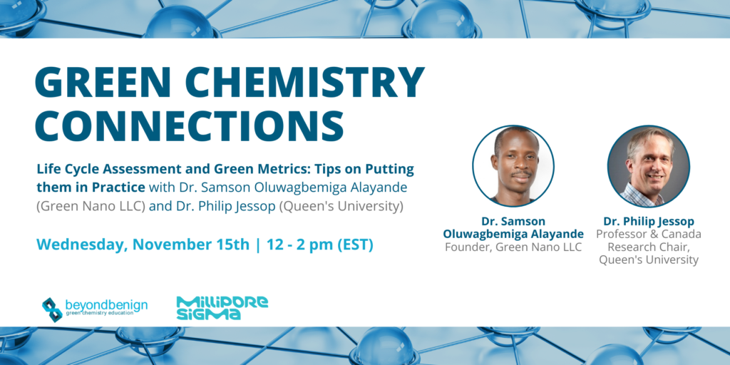 At our November session, you will hear from Dr. Samson Alayande (Founder, Green Nano LLC) and Dr. Philip Jessop (Professor and Canada Research Chair, Queens University, Canada) as they share presentations and insights about life cycle assessments (LCAs).