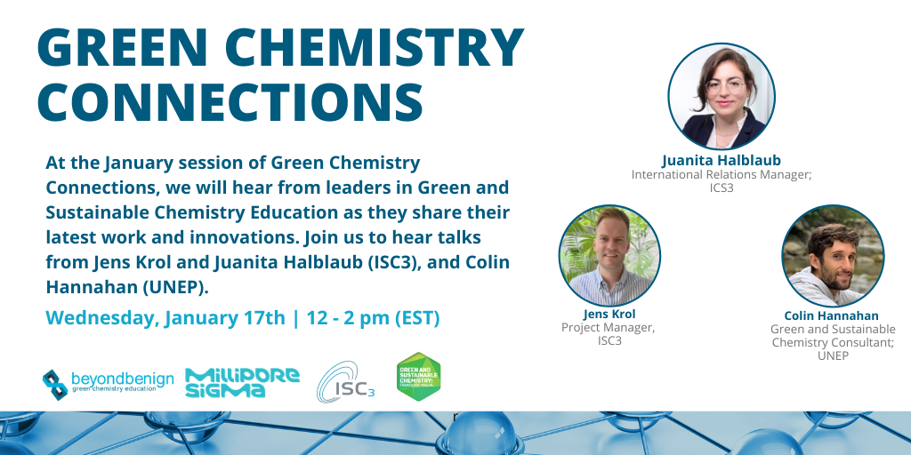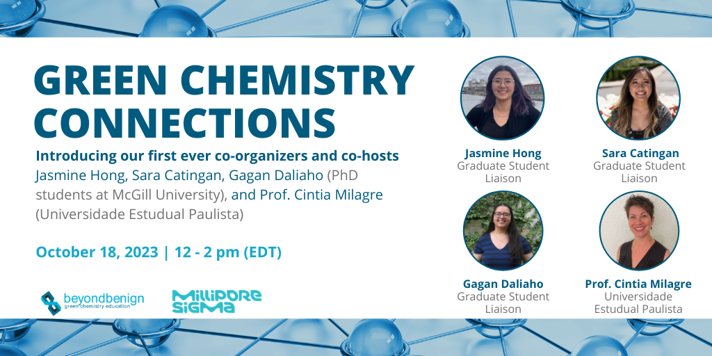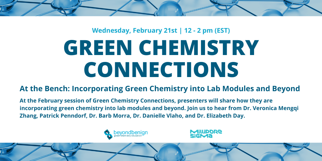 We invite you to bring your departmental colleagues, external collaborators, graduate teaching assistants, etc. to the discussion as we will be holding this space and time monthly for the community to come together around Green Chemistry education to advance the field together!