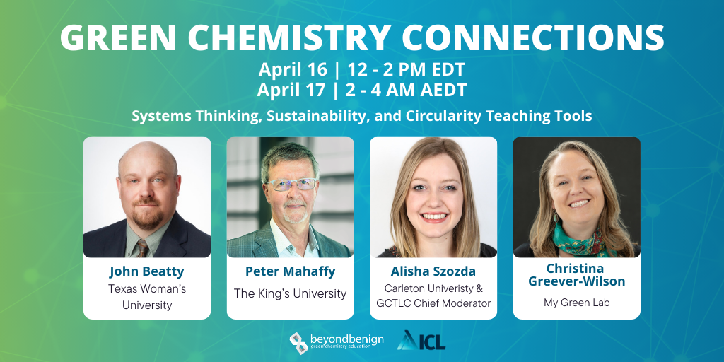 Join our April Green Chemistry Connections session to explore systems thinking, sustainability, and circularity teaching tools with changemakers from Texas Woman’s University, The King’s University, Carleton University, and My Green Lab.