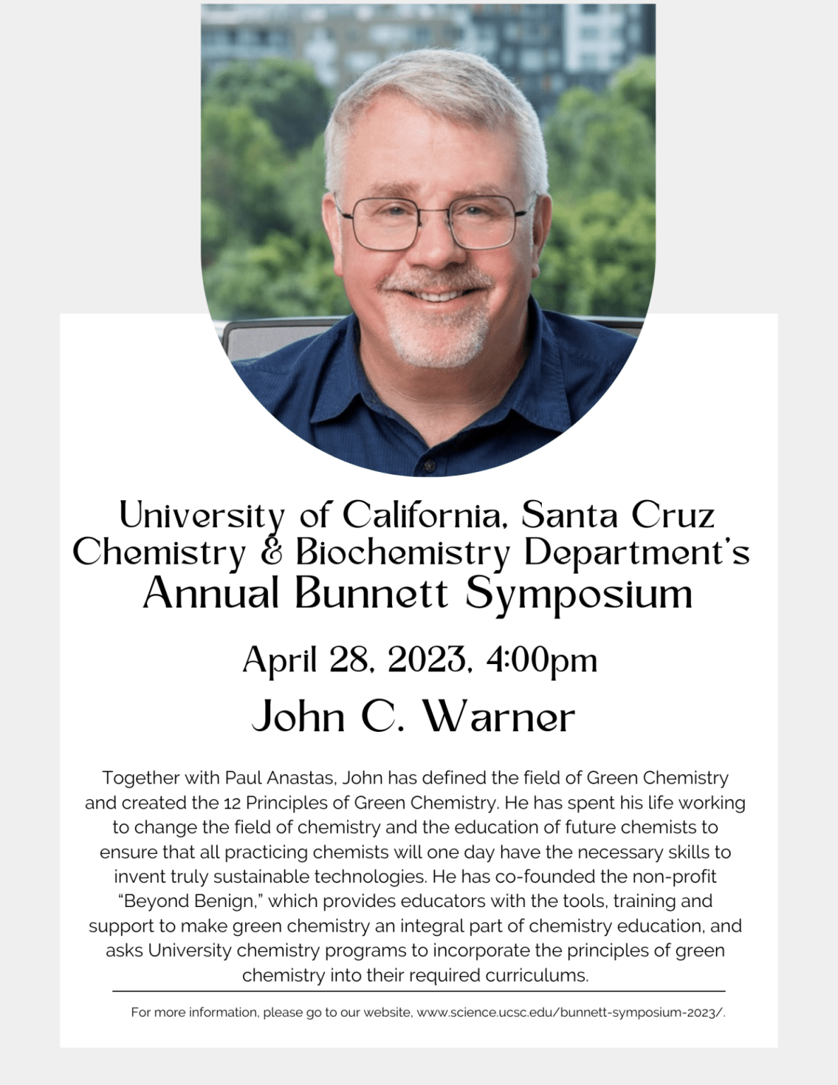 The Bunnett Symposium has evolved into an opportunity to connect past and present friends of the Department for discussion, accompanied by exposure to seminal ideas in chemistry through the distinguished lecture, and an Awards Ceremony where we honor the academic and research achievements of our current crop of outstanding undergraduates.