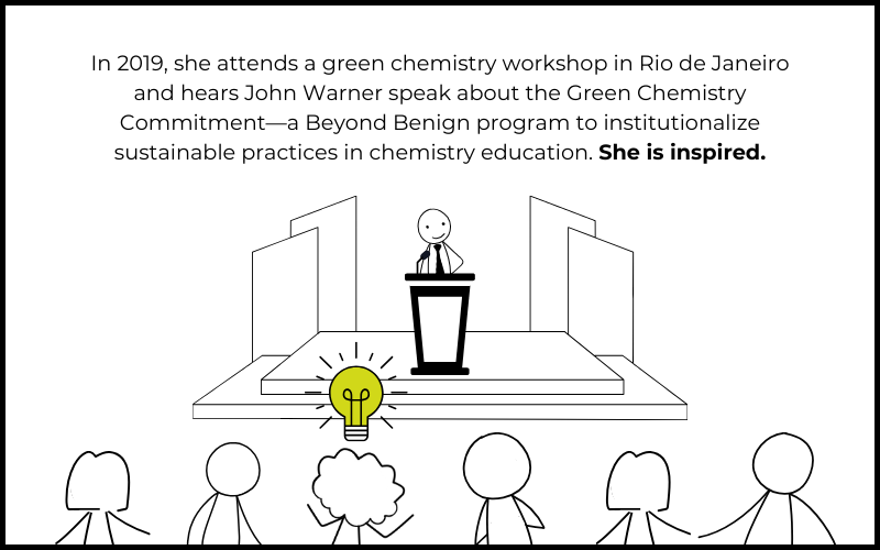 A turning point came in 2019 when Cintia attended a workshop led by green chemistry pioneer and Beyond Benign Co-Founder John Warner. There, she was introduced to Beyond Benign’s Green Chemistry Commitment (GCC)—an initiative providing support and a proven framework for integrating green chemistry principles into education. Inspired by this program and its community-driven approach, she saw how the GCC could transform not only her institution but also create a ripple effect across Brazil.