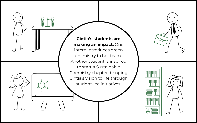 This institutional shift has had widespread ripple effects. Students are applying green chemistry principles in internships and careers, influencing discussions on sustainability in the chemical industry. Her former PhD and MSc students now teach green chemistry in higher education at the K-12 levels. Inspired by Cintia’s work, students at her institution have even organized a Sustainable Chemistry chapter to further promote these values.