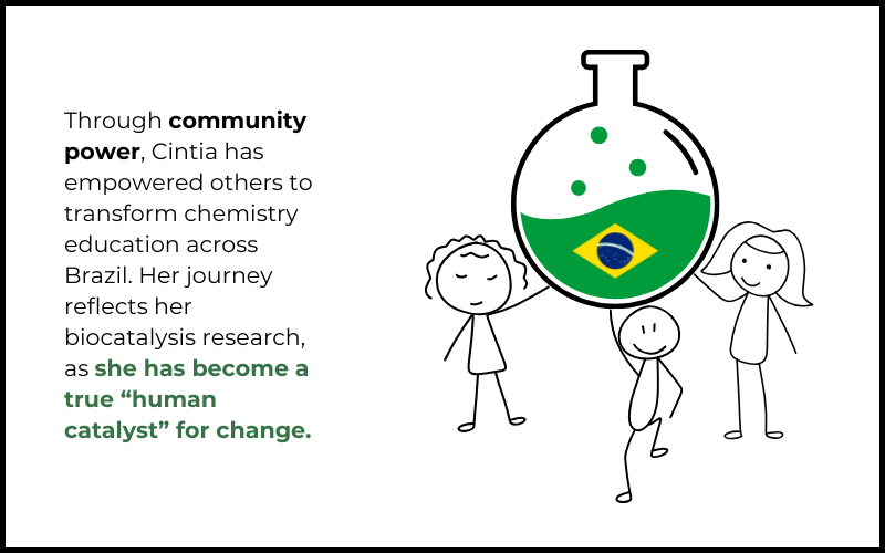 Her green chemistry focus deepened when she joined Professor Isabel Arends’ Biocatalysis and Organic Chemistry (BOC) group, continuing collaborations with folks from TU Delft. By 2012, as an assistant professor at the Institute of Chemistry at UNESP, Cintia launched her independent research on biocatalysis and green chemistry—breaking new ground in her department, where green chemistry was limited to analytical chemistry.